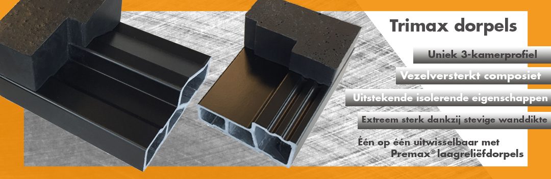 Als uitbreiding op ons bestaande assortiment composietstenen dorpels zijn er nu ook Trimax dorpels. Trimax dorpels zijn vervaardigd uit vezelversterkt composiet en zijn ontworpen met een uniek 3-kamerprofiel uitgevoerd in een strak design. De drie kamers bezitten een stevige wanddikte en zorgen voor een optimale krachtverdeling bij belasting van de dorpel. De dorpels zijn hiermee bestand tegen een hoge druksterkte en zijn daardoor bovengemiddeld sterk.