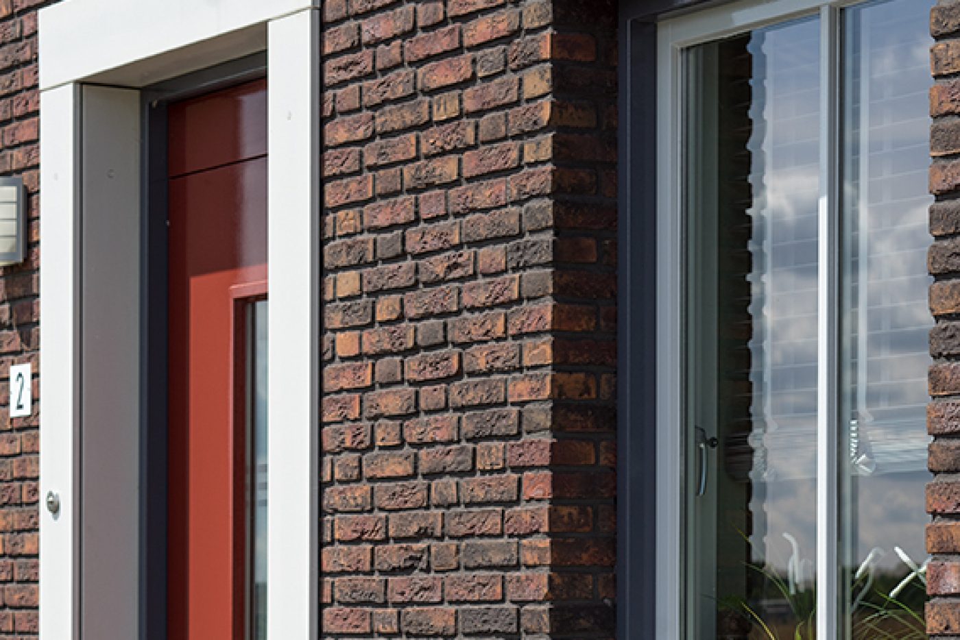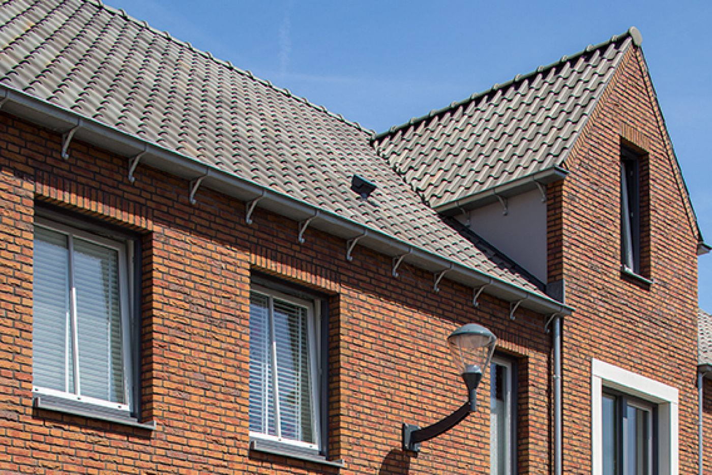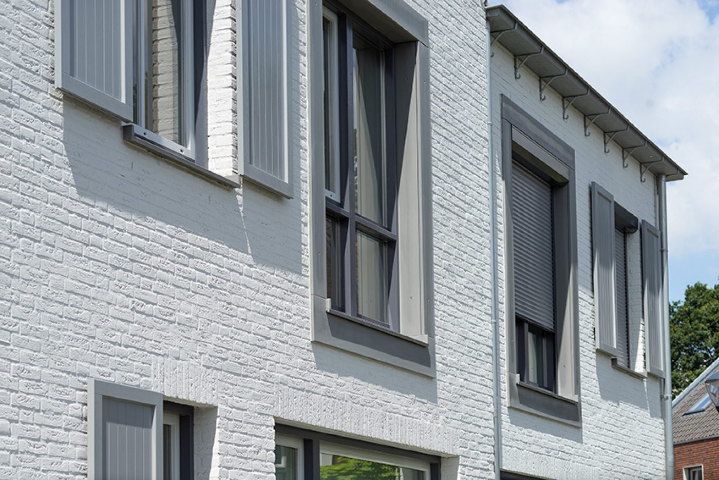 Holonite heeft in dit project bijgedragen met donkergrijze en witte raamdorpels, kaders en muurafdekkers. Ook zijn de schoorstenen van maatwerk afdekkers voorzien. Deze gevelelementen versterken op een subtiele manier het witte en oranje metselwerk.