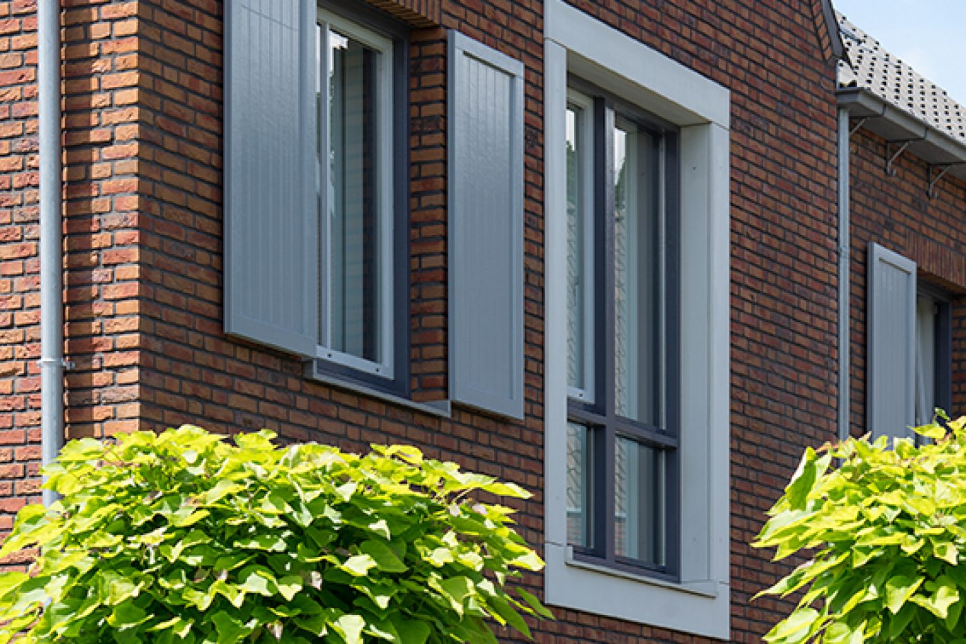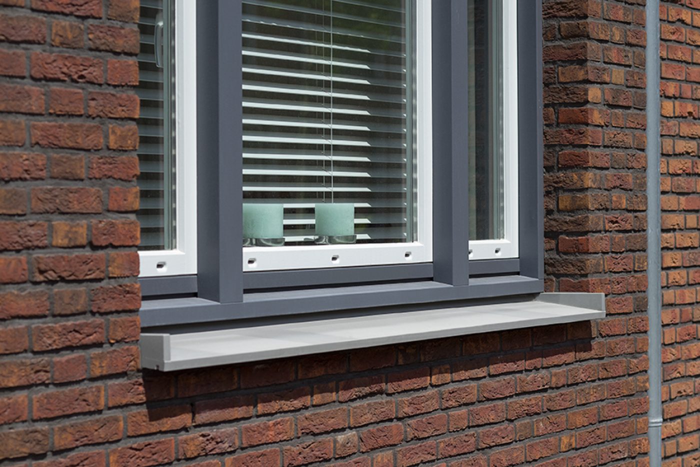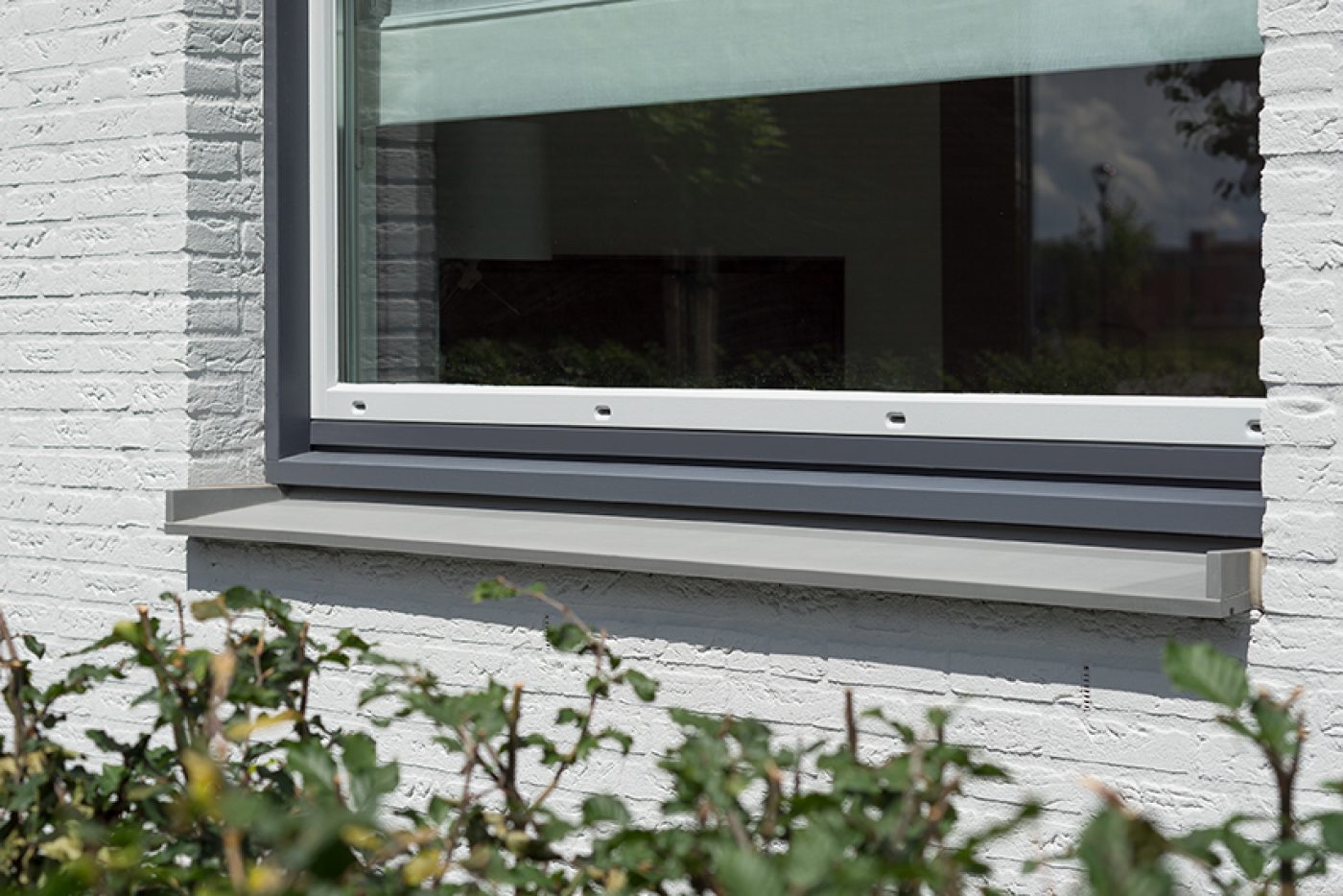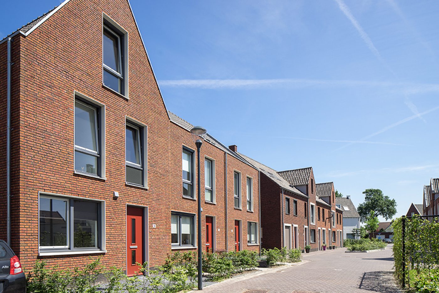Holonite heeft in dit project bijgedragen met donkergrijze en witte raamdorpels, kaders en muurafdekkers. Ook zijn de schoorstenen van maatwerk afdekkers voorzien. Deze gevelelementen versterken op een subtiele manier het witte en oranje metselwerk.
