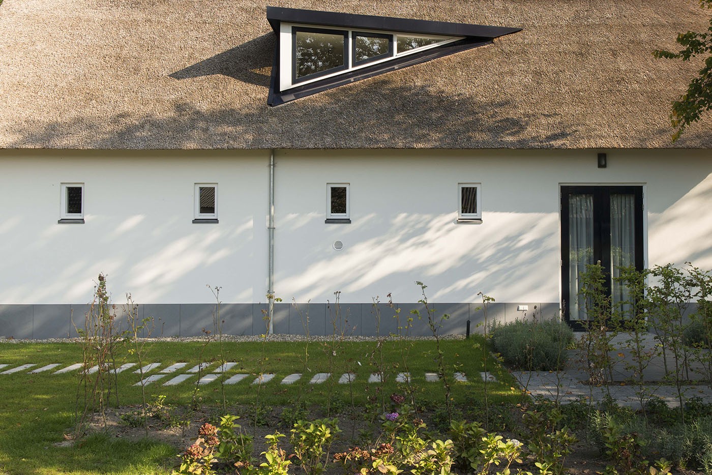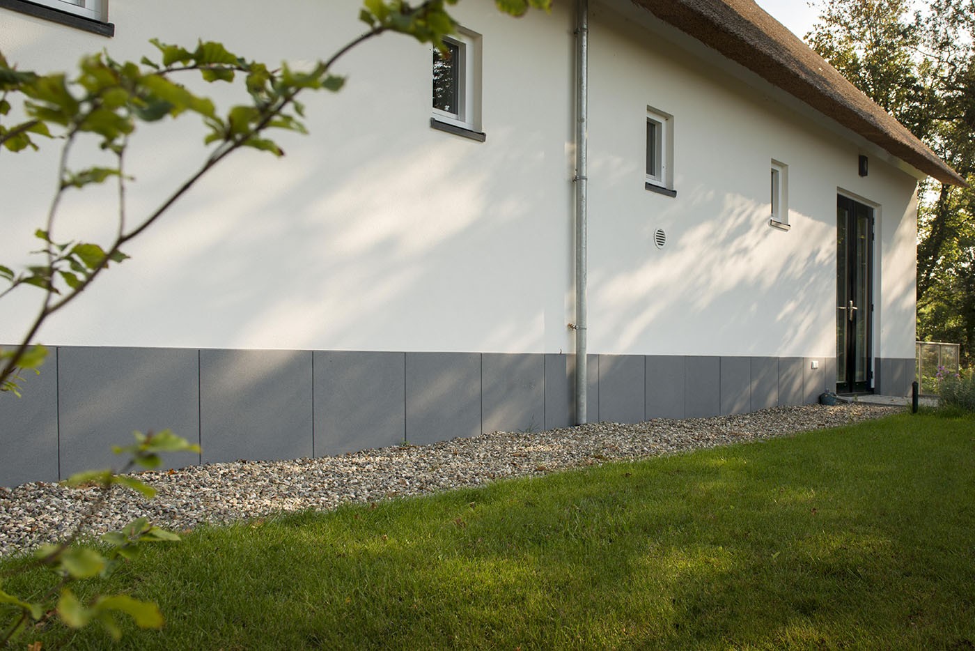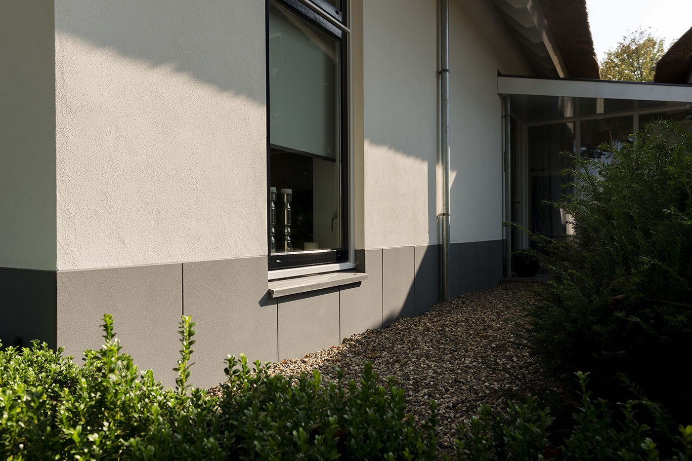 De nieuwe woning van de familie Baartmans is gerealiseerd aan de Achtersloot te IJsselstein. Deze luxe vrijstaande villa bezit ook een bijgebouw. Voor het overgrote deel bestaat de woning uit een geïsoleerde gevel voorzien van stucwerk met aan de onderzijde de Holonite geïsoleerde gevelplint. De plint is uitgevoerd in de kleur Savona welke het geheel een zachte maar ook robuuste look geeft. De geïsoleerde gevelplint draagt bij aan een volledig onderhoudsarme oplossing dankzij de kitloze voegen die bevorderlijk zijn voor het onderhoud. Tegelijkertijd isoleert en beschermt de plint de voet van het gebouw in deze boomrijke omgeving. Ook de Natura zwarte raamdorpels vormen een onderhoudsarme en natuurlijk ogende oplossing. De dorpels zijn voorzien van kopschotten (opstaande randjes) welke vervuiling aan de gevel tegen gaan. De gevel van de woning heeft een Rc-waarde van 6,0 en de EPC van de woning is <0,4.